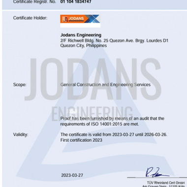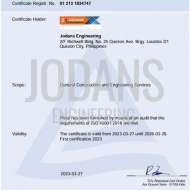 Jodans Engineering is a company established on June 2010, duly registered with the Department of Trade and Industry and other government regulatory agencies, a PCAB license holder engage in general construction business including constructing, design, enlarging, repairing, developing or engaging in any work upon buildings, residential and condominiums, roads, plants, bridges, airfields, piers, waterworks, railroads and other structures.
